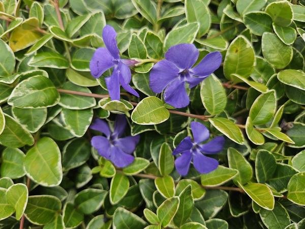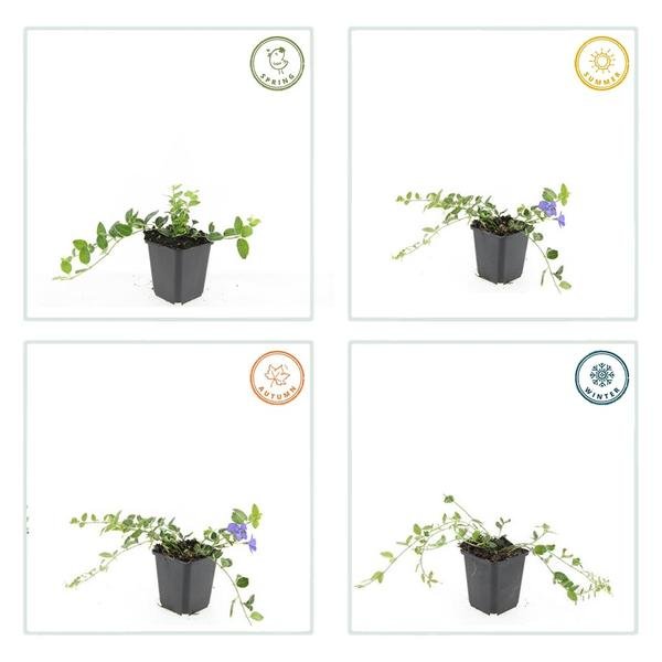 **Vinca minor ‘Ralph Shugert’** – Een wintergroene bodembedekker met glanzende groene bladeren en opvallende lavendelkleurige bloemen. Deze plant is ideaal voor schaduwrijke tuinen en onderdrukt onkruid effectief. Met zijn levendige bloemen en compacte groei voegt hij kleur en textuur toe aan borders en onderbeplanting. Een onderhoudsvriendelijke keuze die het hele jaar door voor een mooie en frisse uitstraling zorgt.