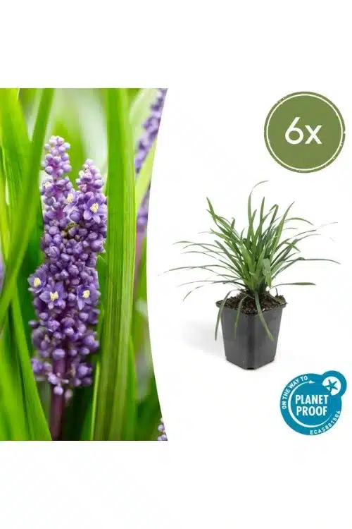 **Liriope muscari ‘Big Blue’** is een prachtige, groenblijvende bodembedekker die perfect gedijt in halfschaduw. Met zijn elegante, smalle bladeren en