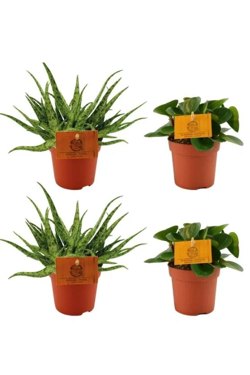 Uiterlijk van de plant: Aloe Spider: Deze plant heeft lange, smalle, groene bladeren die uit een rozet groeien en een spinachtige uitstraling hebben. De bladeren zijn stekelig en hebben een lichtgrijze tint met enkele heldere groene accenten. Peperomia Obtipan Green: Deze plant heeft dikke, ronde bladeren in een diepgroene kleur. De bladeren zijn glanzend en hebben een rijke, donkergroene kleur die zorgt voor een levendig uiterlijk. Bloemen zijn zeldzaam, maar als ze verschijnen, zijn ze klein en onopvallend.