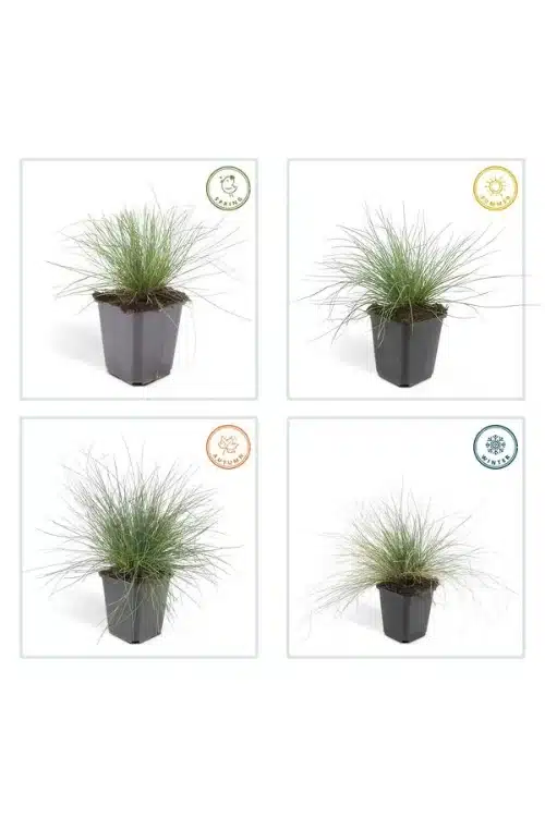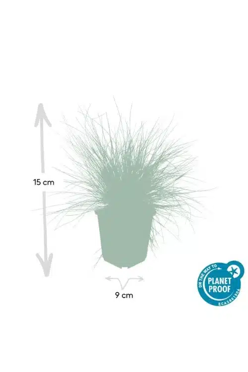 **Festuca glauca ‘Eljae Blue’** is een prachtige, blauwgrijze grassoort die het hele jaar door kleur toevoegt aan uw tuin. Deze onderhoudsvriendelijke plant bloeit in mei en juni met elegante witte pluimpjes. Hij gedijt in de volle zon en op droge, doorlatende grond. Snoei hem in het vroege voorjaar voor optimale groei en deel elke 2-3 jaar om zijn schoonheid te behouden. Perfect voor rotstuinen en borders! Voeg deze eye-catcher toe aan uw tuin en geniet van zijn unieke uitstraling!