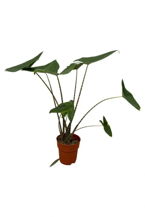 • De Alocasia Zebrina staat bekend om zijn opvallende zebra-achtige stelen en grote, pijlvormige bladeren in een diep groene tint.