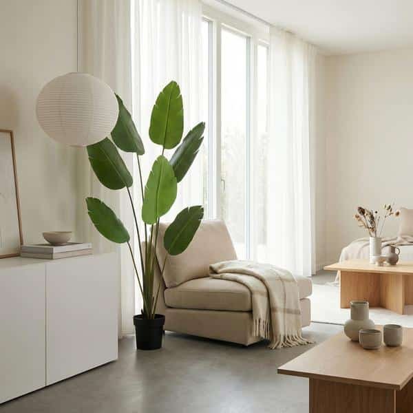 Voeg eenvoudig een indrukwekkend, onderhoudsvrij tropisch accent toe met deze Strelitzia Nicolai – groot, elegant en altijd groen.
