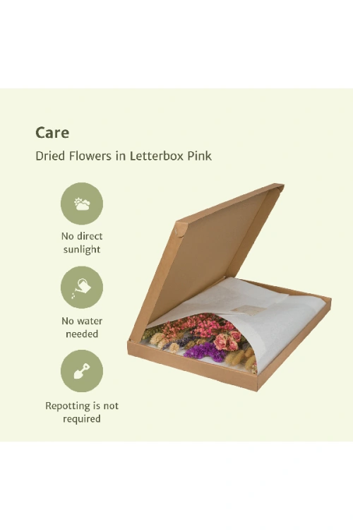 Uiterlijk van het droogboeket: De Droogbloemen in Letterbox Multi is een elegant boeket van gedroogde bloemen en planten in een rijke mix van kleuren en texturen. Het boeket bevat zachte tinten zoals wit, beige en lichtroze, met een variëteit aan vormen en structuren, zoals delicate bloemblaadjes en subtiele graspluimen. Deze combinatie zorgt voor een verfijnd en kleurrijk geheel dat een charmante toevoeging aan elke ruimte is.
