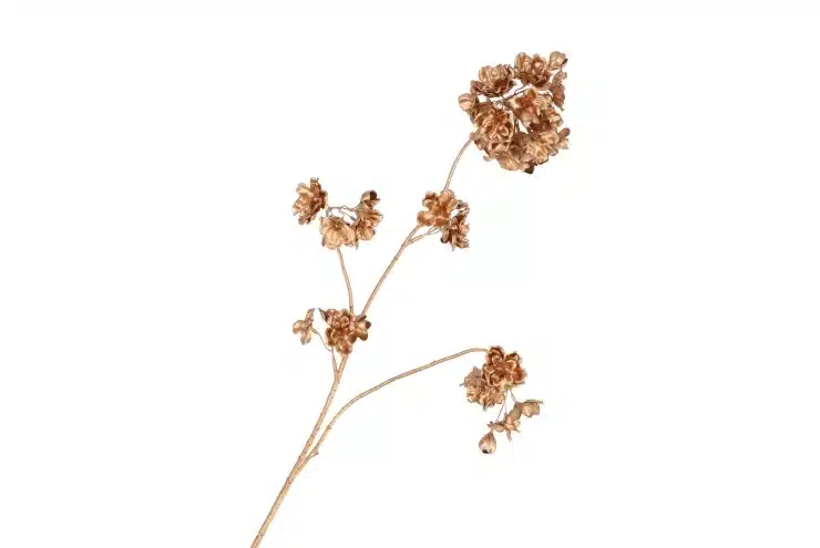 Geef je interieur een luxe en sprankelende uitstraling met de zijdebloem cherry blossom gold van 85 cm. Deze elegante tak is rijk gevuld met verfijnde bloesems in een warme goudtint, waardoor hij direct een chique en stijlvolle sfeer creëert. Perfect als blikvanger in een vaas of als exclusief accent in een zijdebloemenboeket.