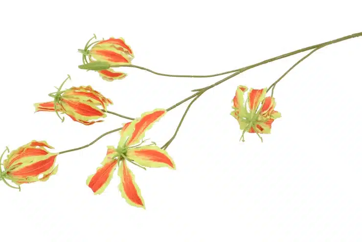 De zijdebloem Gloriosa Red (105 cm) is een opvallende kunsttak met sierlijke, rood gekleurde gloriosa-bloemen. De unieke vorm van de bloemblaadjes en de natuurgetrouwe details geven deze bloem een luxe en realistische uitstraling, waardoor hij nauwelijks van echt te onderscheiden is. Perfect om een elegant en exotisch accent toe te voegen aan je interieur.